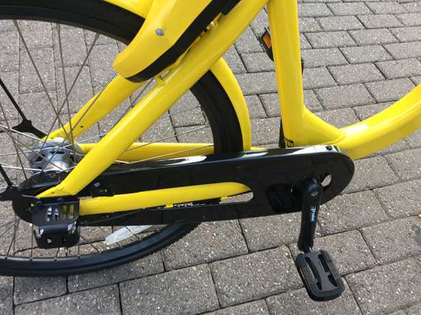 Le bici OFO NON integrano la trasmissione nel telaio come accade nelle bici Mobike ma si limitano a proporre un “copri-catena” tradizionale.