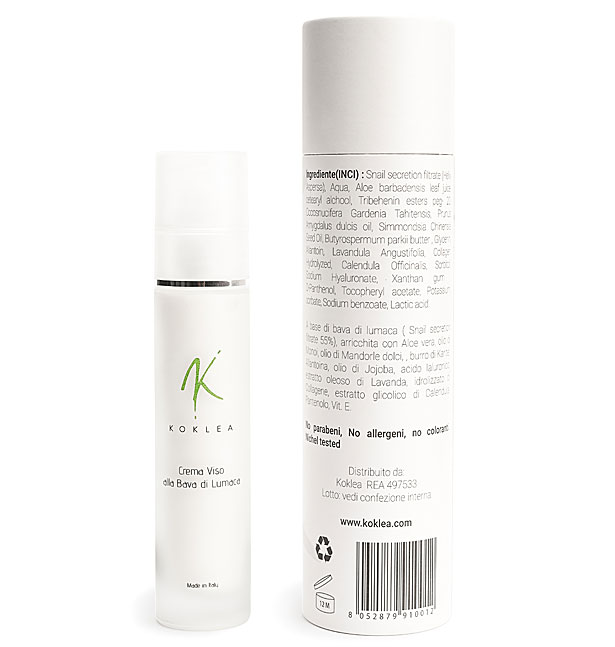 Si tratta della crema viso alla bava di lumaca prodotta da Koklea, un’azienda italiana, che alleva le lumache della famiglia Helix Aspersa Muller, nelle campagne piemontesi, in un ambiente protetto e incontaminato, lontano dallo smog delle grandi città.