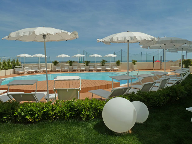 All’esterno il Nautilus propone ai suoi ospiti un’area verde e una una piscina riscaldata dalla forma curvilinea e a due differenti profondità che fonde un design e un’illuminazione hi-tech con colori e materiali (anche qui il legno è protagonista) che richiamano la vegetazione del litorale adriatico.