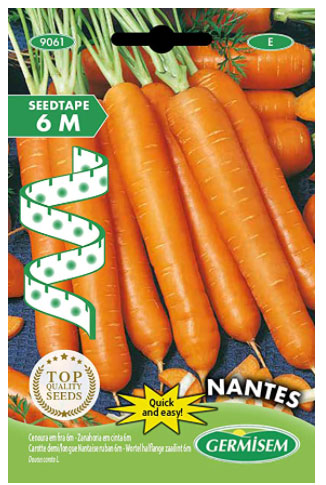 Carota – 6 metri di nastro per semina : le carote di Nantes sono una varietà classica che forma una radice slanciata, ben colorata, di media lunghezza e con estremità smussata. I semi sono confezionati tra due strati di carta biodegradabile. I tempi di germinazione sono di circa 20 giorni con periodo di raccolta tra luglio e novembre.