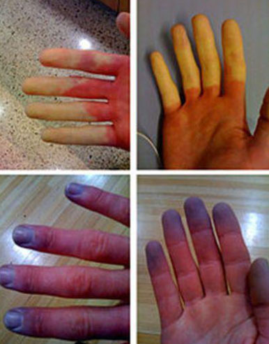 In questo caso però prima di colpire le unghie sentirete intorpidimento e dolore alle dita e le vedrete cambiare colore, talvolta a chiazze. Nell’immagine che segue potete vedere alcuni effetti sulle mani di soggetti che soffrono della sindrome di Raynaud.