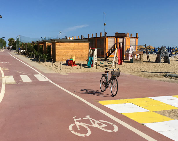 Ovviamente ho approfittato di questa opportunità e, la mattina seguente al mio arrivo, accompagnato da Andrea Farisello, del Gruppo Freedom Bike di Pesaro (che potrete contattare anche voi tramite la reception dell’hotel per organizzare un tour accompagnato), ho percorso la pista ciclabile lungo l’Adriatico. Chiacchierando allegramente e pedalando in riva al mare siamo così arrivati a Pesaro, dopo aver percorso i circa 12 Km che separano Pesaro da Fano.