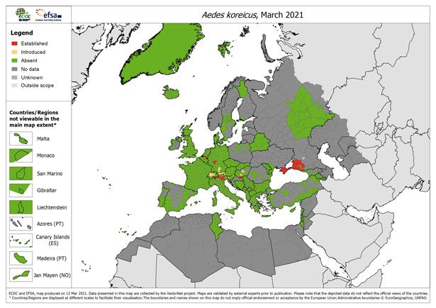 Qui di seguito trovate la mappa relativa alla diffusione della zanzara coreana Aedes koreicus in Europa aggiornata a marzo 2021.