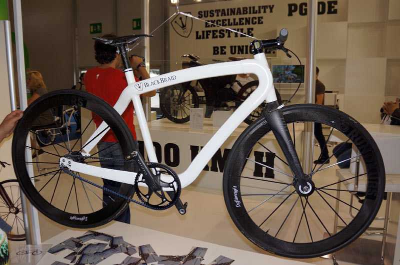 La foto in alto mostra una bambina sollevare una bicicletta. Non è un fotomontaggio! Quella bici pesa poco più di 4 chilogrammi. Si tratta della bicicletta Black Braid progettata dalla PG-BIKES e costruita da Composites di Monaco di Baviera, in Germania La Black Braid è realizzata in fibra di carbonio “superavvolta”. La resina ricavata dalla fibra di carbonio è robbistissima, molto più forte dell’acciaio e decisamente più leggera dell’alluminio.