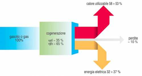 La configurazione più comune di un sistema di cogenerazione pevede l’integrazione tra un motore alimentato con un combustibile (generalmente gas metano), un generatore elettrico e un sistema di recupero del calore. Fatta 100 l’energia del combustibile, il 55% si trasforma in energia termica, il 35% in energia elettrica e il 10% va persa. Il ‘circa’ è d’obbligo ovviamente, ma i valori sono questi.