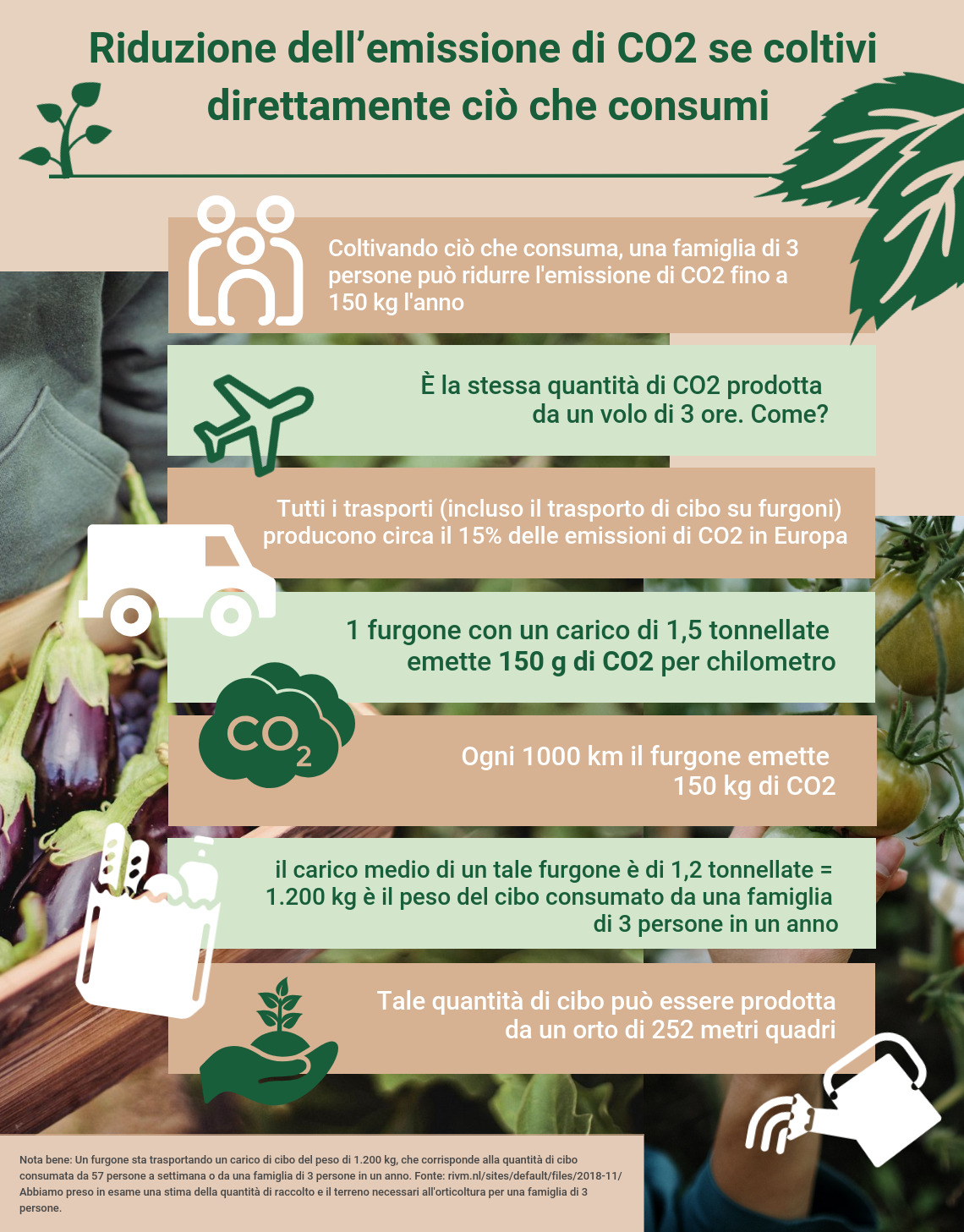 Una famiglia composta da tre persone consuma mediamente 1.200 Kg di alimenti all’anno che a loro volta corrispondono a un furgone pieno di cibo. Un furgone totalmente colmo di prodotti emette in atmosfera 150 grammi di anidride carbonica per ogni chilometro percorso. Il tutto si traduce nell’emissione di ben 150 Kg di CO2 per un tragitto di 1.000 chilometri, che equivale al quantitativo prodotto da un aereo per un volo di tre ore. Il dato è lampante. Se tutti coltivassero in maniera autonoma creando un orto sostenibile, l’ambiente ne gioverebbe enormemente. Piccoli gesti che fanno la differenza, soprattutto se si considera che dal trasporto su strada deriva il 72% di tutte le emissioni di anidride carbonica nel territorio dell’Unione Europea.