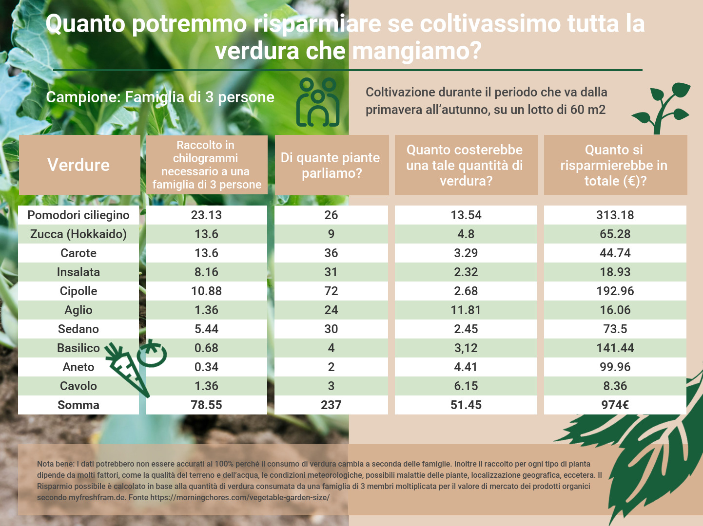Ancora una volta, i dati emersi dal calcolo lasciano spazio a pochi dubbi. Una famiglia di tre persone che coltiva le dieci verdure incluse nella stima (pomodoro ciliegino, zucca, carote, insalata, cipolle, aglio, sedano, basilico, aneto e cavolo) arriva a risparmiare fino a 974 euro in totale. Una bella cifra che può essere quindi messa da parte o investita in altri beni e servizi di utilità familiare.