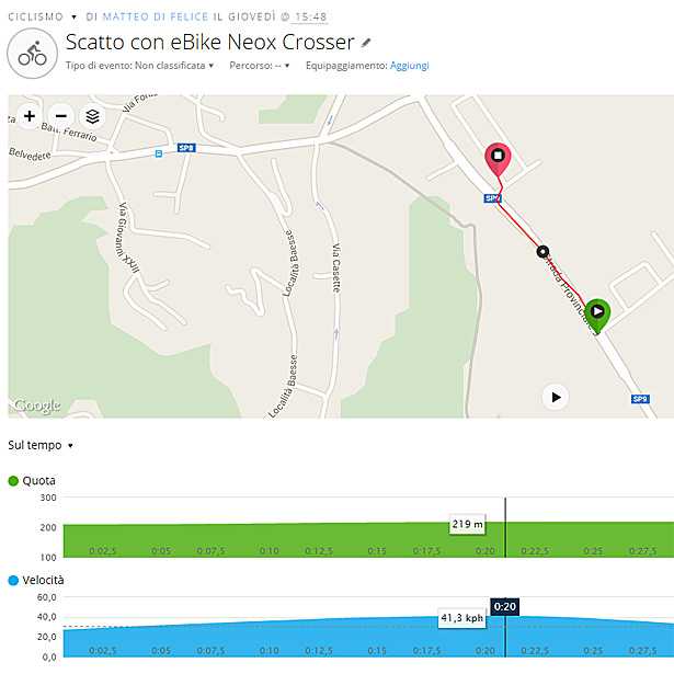 Su strada … si vola! :-) Anche in modalità Eco si raggiungono facilmente velocità elevate: la velocità assistita massima, come da disposizioni di legge è di 25 Km/h ma quando ho provato “un piccolo allungo” ho raggiunto in pochi secondi senza sforzo i 41 Km/h, come documentato anche dal mio orologio GPS Garmin da polso.