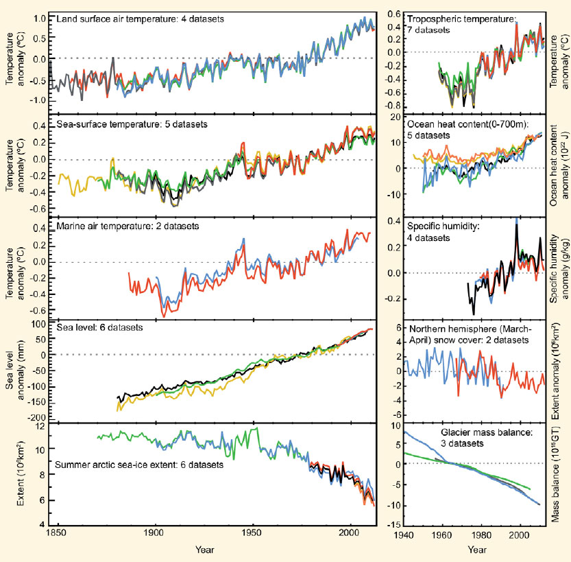 In questi ultimi anni vi sono state molte analisi che, in modo indipendente, hanno rilevato importanti cambiamenti nel sistema climatico, che riguardano numerosi aspetti e componenti. Da questo ampio corpus di studi emerge che il riscaldamento globale è “inequivocabile” e che «dalle profondità oceaniche fino alla cima della troposfera, l’evidenza di aria, suolo ed oceani più caldi, di ghiaccio che fonde e di mari che si innalzano, punta inequivocabilmente un fatto: il mondo si è riscaldato dalla fine del XIX secolo» (Hartmann et al. 2013, 188). La figura proposta, ripresa da (Hartmann et al. 2013, 161) mostra l’evoluzione temporale di dieci grandezze fisiche che evidenziano, in modo totalmente concorde l’esistenza e la gravità del riscaldamento globale. Parallelamente, sul fronte dell’attribuzione, le ricerche hanno evidenziato che: «è estremamente probabile che le attività umane abbiano causato più della metà dell’aumento osservato della temperatura superficiale media globale dal 1951 al 2010» (Bindoff et al. 2013, 869). Si noti come con le locuzioni «virtualmente certo» ed «estremamente probabile» fanno parte del gergo tecnico usato nei rapporti dell’IPCC e indicano, rispettivamente, probabilità pari al 99% e il 95%.