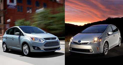 Il solo motore elettrico può raggiungere 135 km/h, la Ford non ha voluto sacrificare la potenza così come ha fatto la Toyota con la sua Prius: la Prius (a destra nella foto qui in alto), in modalità elettrica, consente una velocità massima di 50 km/h, un grosso punto a favore della C-Max ibrida Ford.
