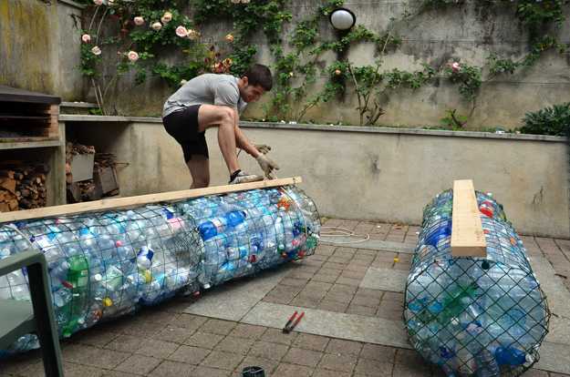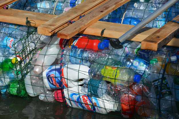Per riempire i tubi sono stati usati più di 700 contenitori di plastica di varie forme e dimensioni: dai flaconi di detersivo alle bottigliette d’acqua da mezzo litro che abbiamo raccolto da dei locali che ce le tenevano gentilmente da parte. Abbiamo ottenuto una spinta di galleggiamento pari a 350Kg per cui si poteva stare benissimo anche in 4 o 6, forse abbiamo anche esagerato con le dimensioni.