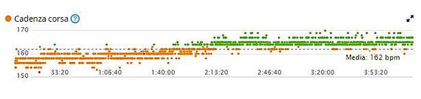In effetti ho verificato che, tenendo un passo più lento la mia cadenza è stata riportata con dei pallini arancioni disposti in basso sul grafico. Quando, durante l’allenamento, ho aumentato l’andatura aumentando la frequenza e accorciando lievemente la falcata, i pallini sono diventati verdi e si sono disposti verso l’alto, ad indicare che mi ero avvicinato alla cadenza media proposta da Garmin.