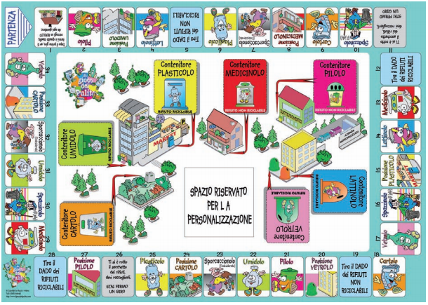 Tra i giochi da tavola per bambini dedicati alla raccolta differenziata segnaliamo il progetto “Il Gioco del Pulito” che mira a innescare l’idea della raccolta differenziata e del riciclo dei rifiuti ai più piccini mediante un tabellone colorato. Il gioco da tavolo è per 2 o 4 giocatori, è composto da un tabellone che traccia il percorso del gioco, un mazzo con 28 carte rappresentanti i rifiuti, tre dadi e i personaggi. Tra i personaggi, per vivacizzare il gioco c’è lo Spazzino e lo Sporcaccione!