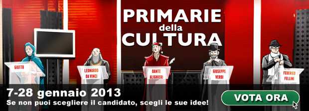 L’iniziativa si chiama ‘Le Primarie della Cultura’ ed è attiva dal 7 al 28 gennaio 2013 sul sito Web dedicato. È questa la prima volta che in Italia viene indetta una grande consultazione popolare con lo scopo di promuovere e valorizzare soluzioni nell’ambito della cultura, del paesaggio e dell’ambiente.