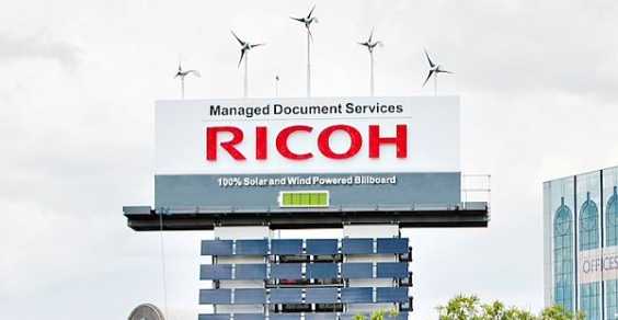 Fa piacere dare conto di queste iniziative, e non si tratta di pubblicità. Lo sviluppo delle insegne ecocompatibili eoliche e solari è iniziato nell’aprile del 2009 in casa Ricoh. L’installazione della prima insegna è avvenuta a Times Square, New York, nel 2010 e altri due sono stati successivamente installati a Londra e a Sydney. Complessivamente le tre insegne citate consumano attorno a 150.000 Wh al giorno di energia elettrica autoprodotta.