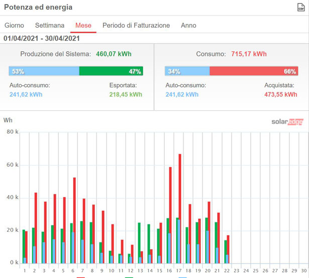 Nella prima interfaccia, ogni utente ha la possibilità di vedere la potenza istantanea e l’energia prodotta dall’impianto giornalmente, mensilmente e annualmente. Installando uno specifico contatore aggiuntivo con delle pinze amperometriche, è possibile controllare anche l’energia consumata dalla casa, quella immessa in rete e quella eventualmente immagazzinata in un sistema di accumulo. Come si vede di seguito, nella schermata relativa all’impianto Idee Green, in un istogramma molto intuitivo si vede, per ogni giorno dell’ultimo mese, l’energia prodotta, quella destinata all’autoconsumo e il consumo totale.