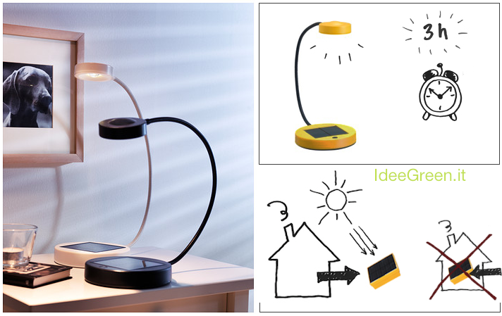 La lampada fotovoltaica Ikea trasforma la luce del sole in elettricità, infatti per funzionare non necessita di elettricità ma basta ricaricare il pannello solare esponendolo al sole per 9-12 ore così da ottenere 3 ore di luce artificiale. Tale lampada sfrutta la tecnologia LED così da aumentare l’efficienza energetica. Le batterie che saranno caricate dalla luce solare potranno affrontare almeno 500 cicli completi. La lampada fotovoltaica Ikea cossta circa 12 euro.