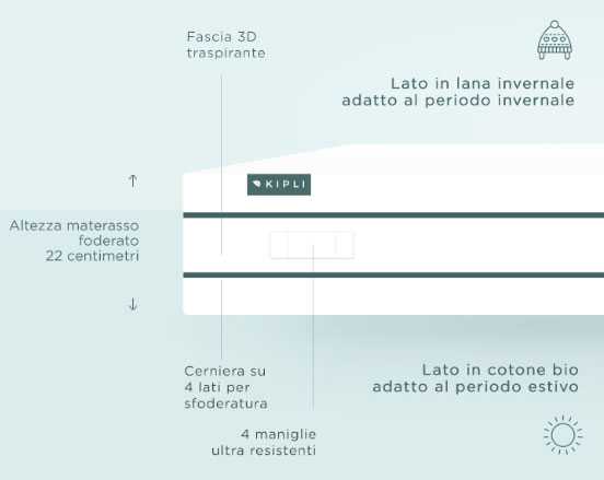 La fodera del materasso Kipli® è concepita per sposarsi perfettamente alle caratteristiche del materasso, grazie alla presenza di due lati diversi che seguono l’andamento delle stagioni e la sensazione di comfort di chi lo utilizza: