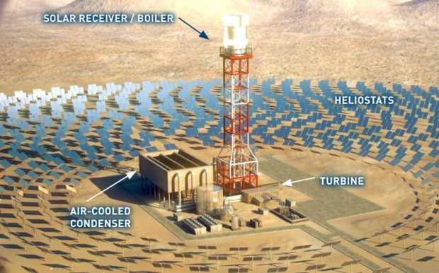 Il funzionamento si basa sulla concentrazione dei raggi solari su tre torri che contengono serbatoi di acqua che in questo modo si trasforma in vapore alimentando potenti turbine che producono energia pulita.