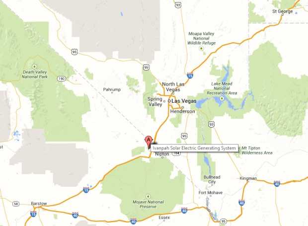 Ecco altre due immagini dell’impianto solare più grande del mondo: Ivanpah Solar Electric Generating System con 300.000 specchi e tre torri robotizzate, alte quasi 50 metri, uno schema del funzionamento e la mappa che individua il luogo in cui è stato costruito.