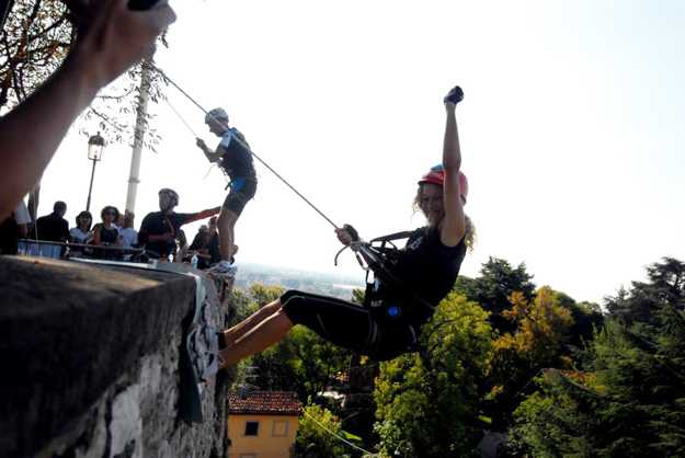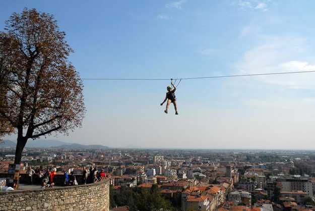La prova speciale prevedeva di lanciarsi appesi in sicurezza a un cavo sospeso a 30 metri di altezza nei pressi delle mura della Città Alta! Sicuro e divertente ma per lanciarsi ci vuole di certo una buona dose di coraggio!