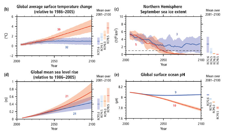 Gli scenari di emissione dei 3 principali gas serra antropici (CO2, CH4, N2O) e di SO2 e i livelli di forzante radiativo risultanti per i vari RCP sono mostrati in Figura 1. La Figura 2 mostra gli scenari di concentrazione per CO2, N2O, CH4 e CFC12-eq, mentre la Figura 3 mostra a titolo di esempio le proiezioni future di temperatura, ghiaccio marino, copertura di neve e pH oceanico per cui si rimanda alla corrispondente voce di glossario (“acidificazione degli oceani”).