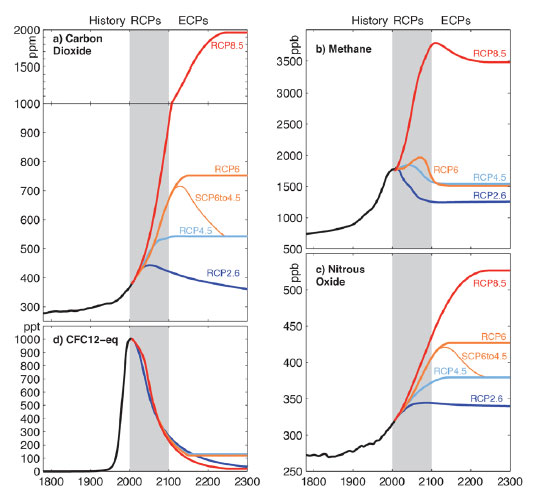 – Meinshausen, M., Smith, S.J., Calvin, K. et al. The RCP greenhouse gas concentrations and their extensions from 1765 to 2300. Climatic Change 109, 213 (2011).