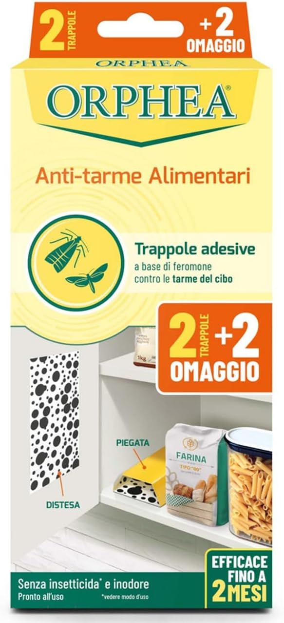 Come usarle? Queste trappole possono essere posizionate dentro o fuori dalla dispensa, l’importante è tenerle lontane da correnti d’aria o fonti di luce. Sarà necessario rimuovere la pellicola di protezione: le tarme del cibo, attratte dai feromoni, rimarranno incollate alla superficie adesiva.