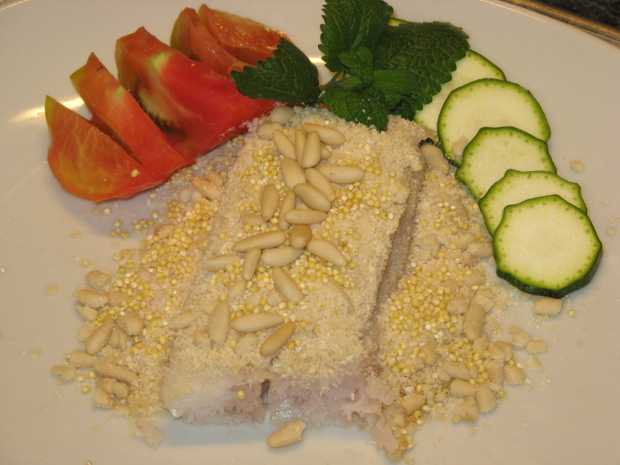 Preparazione. Dopo aver pulito, sfilettato (se non è in tranci) e lavato bene il tombarello, tagliate i filetti a metà per il lato corto e ricavate 4 tranci che terrete da parte. Intanto fate sciogliere 20 g del burro (un’astuzia da chef è usare burro chiarificato) e unitevi la farina di riso (la preferiamo perché è più leggera di quella di grano) e fuori dal fuoco anche la birra mescolando con una frusta; salate e pepate la crema così ottenuta. A parte mescolate il pan grattato con i pinoli sbriciolati (tenetene da parte alcuni per la guarnizione), unite la maggiorana tagliata fine, il parmigiano, sale e pepe. Disponete i 4 tranci di tombarello in una pirofila da forno (o adagiatele su una placca foderata con carta da forno) e spalmateli di abbondante crema alla birra, quindi cospargeteli con il composto e ultimate versando sopra i tranci ricopeti la parte restante del buro fuso. A questo punto informate a 230°C (il forno deve essere già caldo) per non più di 5 minuti.